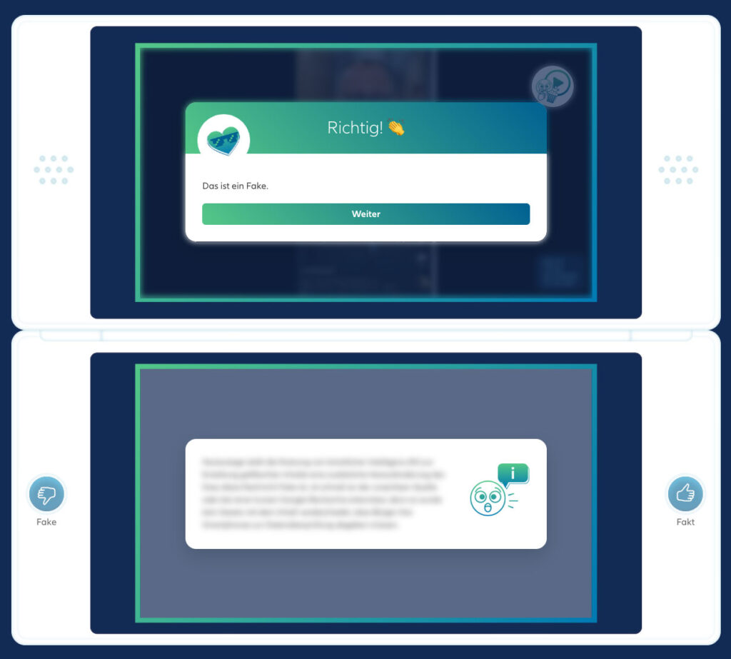 Diese Herausforderung haben wir gerne angenommen und sind sehr stolz auf das entstandene Produkt. Die Spieloberfläche ist angelehnt an das Design von Retro-Spielekonsolen, umgesetzt in einer modernen klaren Formsprache mit spielerischen Elementen wie Emojis sowie Daumen hoch/runter, angelehnt an den Themenbereich „Soziale Medien“.