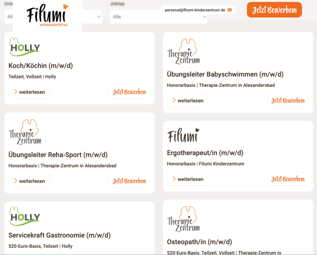 Auf der neuen Website können sich interessierte Bewerber:Innen einen Überblick über die verschiedenen Stellenangebote des Osteopathischen Kinder-Zentrum, Therapie-Zentrum sowie das Café & Bistro Holly und der Fachakademie für Osteopathie (FAFO) informieren und bewerben.